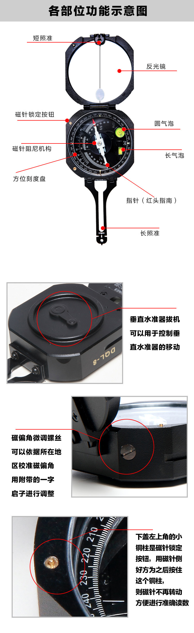 本仪器是利用一个磁性物体(即磁针)具有指明磁子午线的一定方向的特性,配合刻度环的读数,可以确定目标相对于磁子午线的方向。根据两个选定的测点(或已知的测点),可以测出另一个未知目标的位置。